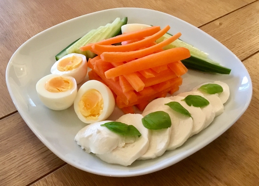 Carrot tower! With boiled eggs, cucumber, mozzarella and fresh basil.